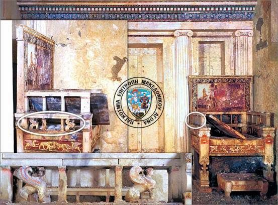 Συγκεκριμένα στις πλαϊνές παραστάσεις του Ταφικού Θρόνου υπάρχουν δύο σκαλισμένες σφίγγες, χρωματισμένες με γαλάζιο και κόκκινο, όπως φαίνεται στην παραπάνω φωτογραφία-ντοκουμέντο! Ο Τάφος χρονολογείται περί το 344-343 π.Χ..