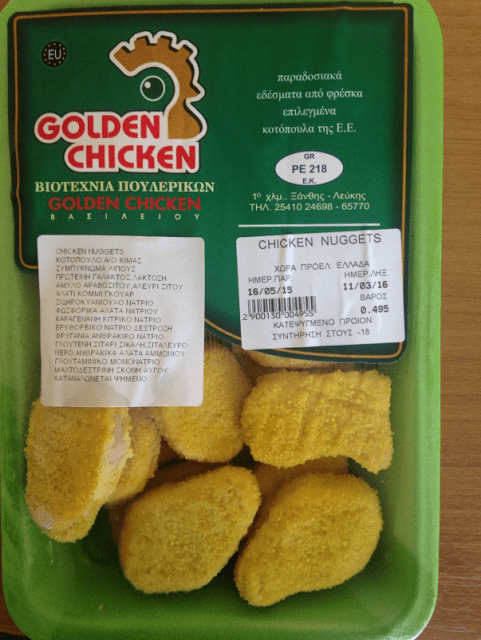 Ο Ε.Φ.Ε.Τ. και συγκεκριμένα η Περιφερειακή Διεύθυνση Ανατολικής Μακεδονίας & Θράκης, στο πλαίσιο των ελέγχων που διενεργεί και σε συνεργασία με το ΚΕΕΛΠΝΟ, Περιφερειακό Εργαστήριο Δημόσιας Υγείας Θεσσαλίας, διενήργησε δειγματοληψία κατεψυγμένου προϊόντος «CHICKEN NUGGETS» από κρέας κοτόπουλου, συσκευασμένο σε συσκευασίες των 500 γραμμαρίων περίπου, με ημερομηνία παραγωγής 16/5/2015 και ημερομηνία λήξης 11/3/2016, με χώρα προέλευσης την Ελλάδα, το οποίο παρήχθη στην Βιοτεχνία Παραγωγής Νωπών & Κατεψυγμένων Πουλερικών, Βασιλείου Παναγιώτης, με διακριτικό τίτλο «GOLDEN CHICKEN», 1 ο χλμ Ξάνθης – Λεύκης, με κωδικό έγκρισης GR PE 218 EK. Στα δείγματα ανιχνεύθηκε ο παθογόνος μικροοργανισμός Salmonella spp.