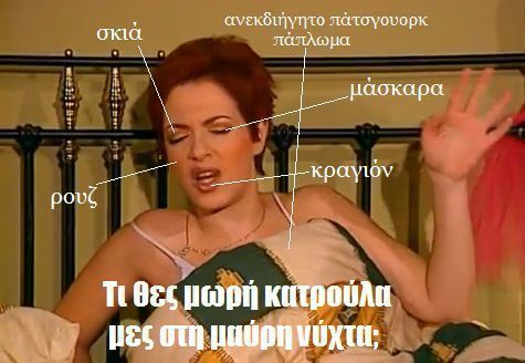 Δεν χρειάζεται περαιτέρω εξήγηση. Όποτε την ξυπνάει η Κατακουζήνα, η Ελένη μισοσηκώνεται κάτω από το πάτσγουορκ πάπλωμά της, με την σκιά της, το eyeliner της, το έντονο ρουζ της, όλα στην εντέλεια, και με απόλυτη φυσικότητα λέει «τι θες μωρή Κατακουζήνα, πάλι περίοδο έχεις;»