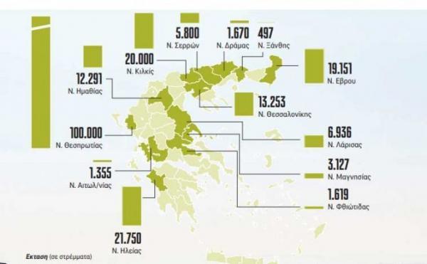 Συνολικά, σύµφωνα µε το «Εθνος», θα αναδιανεµηθούν 207.449 στρέµµατα σε 13 Περιφερειακές Ενότητες σε όλη την Ελλάδα, βάσει µοριοδότησης και κοινωνικών κριτηρίων. Τα περισσότερα από αυτά βρίσκονται στη Θεσπρωτία, στην Ηλεία, στο Κιλκίς, στη Θεσσαλονίκη και στην Ηµαθία.