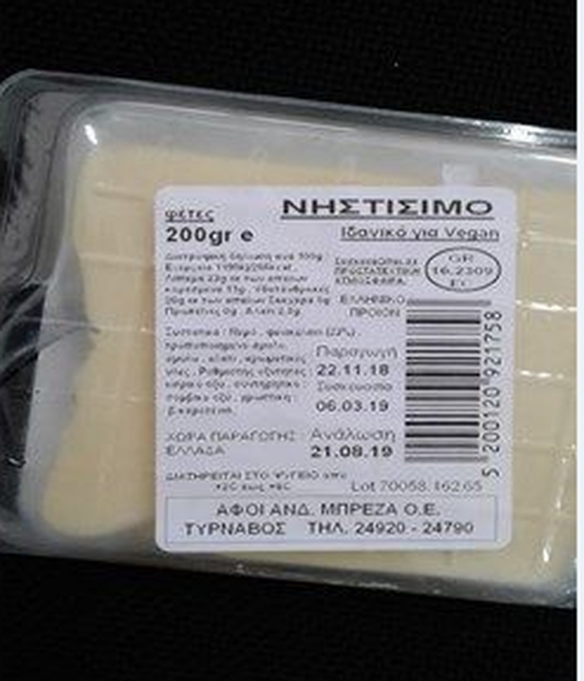 Πρόκειται για το προϊόν: «Νηστίσιμο, ιδανικό για vegan», ελληνικής προέλευσης σε συσκευασία προστατευμένης ατμόσφαιρας των 200 γρ., τυρί κομμένο σε φέτες.Το προϊόν έχει κωδικό παραγωγής Lot: 70058.162.65 και ημερομηνία παραγωγής: 22/11/2018, ημερομηνία συσκευασίας: 06/03/2019 και ημερομηνία ανάλωσης: 21/08/2019.