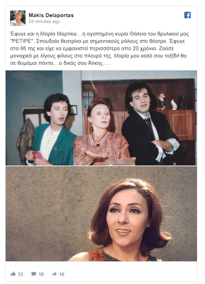 «Έφυγε και η Μαρία Μαρτίκα….η αγαπημένη κυρία Θάλεια του θρυλικού μας “ΡΕΤΙΡΕ”. Σπουδαία θεατρίνα με σημαντικούς ρόλους στο θέατρο. Έφυγε στα 86 της χρόνια και είχε να εμφανιστεί περισσότερο από 20 χρόνια. Ζούσε μοναχικά με λίγους φίλους στο πλευρό της. Μαρία μου καλό σου ταξίδι! θα σε θυμάμαι πάντα….ο δικός σου Άλκης…..», έγραψε.