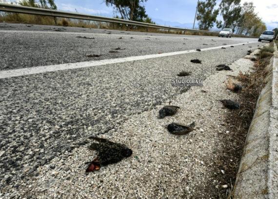 Ειδικότερα, όπως μεταδίδει το argolikeseidhseis.gr, τα άτυχα πουλιά εντοπίστηκαν από περαστικούς της περιοχής, άλλα να κείτονται νεκρά σε μεγάλη έκταση και άλλα να ξεψυχούν επάνω στο οδόστρωμα.