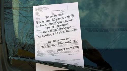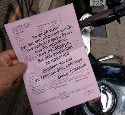 «Τη φορά αυτή δεν θα σου κόψουμε κλήση. Την επόμενη φορά όμως που θα παρκάρεις στον πεζόδρομο θα σου επιβληθεί το πρόστιμο. Βοήθησε και εσύ να ζήσουμε όλοι καλύτερα. ΔΗΜΟΣ ΤΡΙΚΚΑΙΩΝ».