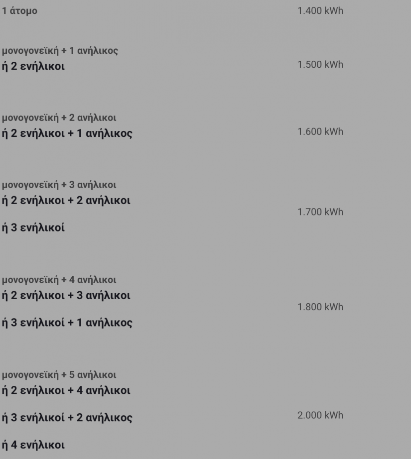 Για νοικοκυριό που στη σύνθεσή του περιλαμβάνει και άτομο ή άτομα με αναπηρία 67% και άνω τα παραπάνω όρια κατανάλωσης αυξάνονται κατά 300 kWh. Για νοικοκυριό που στη σύνθεσή του περιλαμβάνει και άτομο ή άτομα που έχουν ανάγκη μηχανικής υποστήριξης με χρήση ιατρικών συσκευών, η οποία παρέχεται κατ’ οίκον και είναι απαραίτητη για τη ζωή τους, τα παραπάνω όρια κατανάλωσης αυξάνονται κατά 600 kWh.