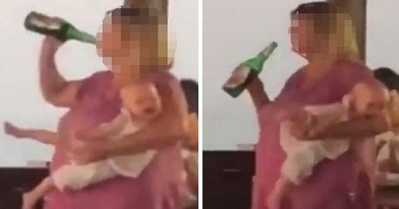 Με το αναστατωμένο μωρό στο αριστερό της χέρι, κρατάει τη μπύρα με το δεξί της και φαίνεται να “κατεβάζει” μονορούφι το μπουκάλι των 620ml.