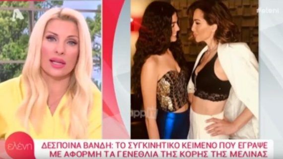 Δείτε επίσης: Η Δέσποινα Βανδή μας δείχνει για πρώτη φορά το πρόσωπο της κόρη της Μελίνας Την θυμάμαι αυτή την περίοδο, ήταν πραγματικά πολύ ευτυχισμένη η Δέσποινα. Τα λόγια που διαβάζω σήμερα για το παιδί της, ακουμπάνε την καρδιά μου και ξέρω πόσο αληθινά είναι», ανέφερε η Ελένη Μενεγάκη διαβάζοντας στον αέρα την ανάρτηση της Δέσποινας Βανδή για την κόρη της Μελίνα», είπε η Ελένη Μενεγάκη και στη συνέχεια διάβασε όσα έγραψε η Βανδή στον προσωπικό της λογαριασμό στο Instagram.