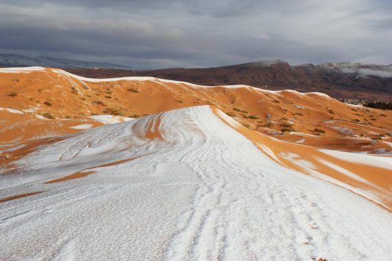 Μπορεί να πλησιάζουμε στα Χριστούγεννα και ακόμα να μην έχουμε δει χιόνια μέσα στην Αθήνα, είδαν όμως στη Σαχάρα! Ναι σωστά διαβάσατε, στην έρημο Σαχάρα. Πρόκειται για το μικρό χωριό Άιν Σέφρα στην Αλγερία, όπου σύμφωνα με κατοίκους της περιοχής εχθές το απόγευμα άρχισε ξαφνικά να χιονίζει για ώρες.