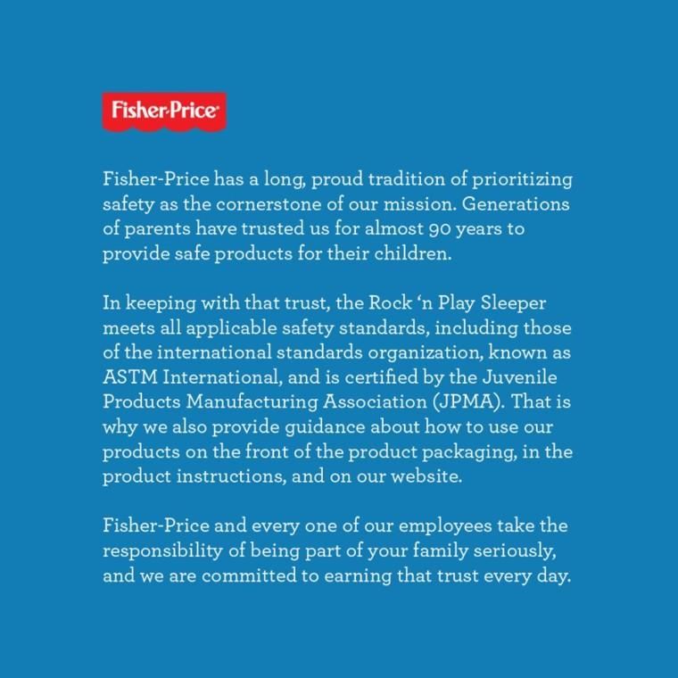 Ο Τσακ Σκότον, γενικός διευθυντής της εταιρείας, τόνισε ότι το εν λόγω ριλάξ πληροί όλα τα ισχύοντα πρότυπα ασφαλείας και συμπλήρωσε: «Ο θάνατος ενός βρέφους είναι μια αδιανόητη τραγωδία. Η Fisher Price και όλοι οι υπάλληλοί μας παίρνουν πολύ σοβαρά την ευθύνη να είναι μέρος της οικογένειάς σας και είμαστε δεσμευμένοι να κερδίζουμε την εμπιστοσύνη σας κάθε μέρα».