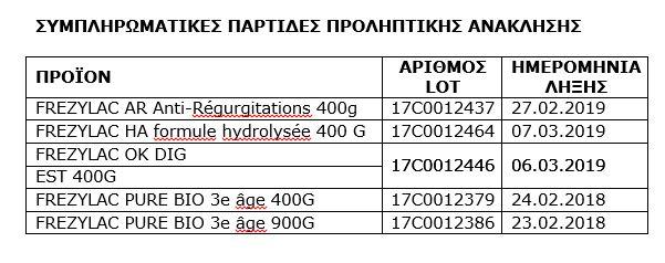 «Μετά την ανακοίνωση της 21ης/12/2017 της γαλλικής εταιρείας Lactalis περί συμπληρωματικής προληπτικής ανάκλησης, με την οποία αποσύρεται το σύνολο της παραγωγής του συγκεκριμένου εργοστασίου της CRAON από 15/2/2017, η FREZYDERM ακολουθώντας την παγκόσμια προληπτική διαδικασία και σε συνεννόηση με τον Ε.Ο.Φ. ανακαλεί και τις 5 συμπληρωματικές παρτίδες.