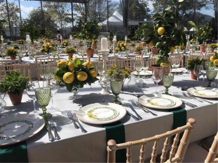 Στις συνθέσεις που στολίζουν τα τραπέζια δεσπόζουν λεμόνια και είναι άκρως εντυπωσιακές, ενώ στα πιάτα έχουν τοποθετηθεί αναμνηστικά σουπλά με τα ονόματα του ζευγαριού και την ημερομηνία του γάμου σε πλαίσιο με φύλλα ελιάς.