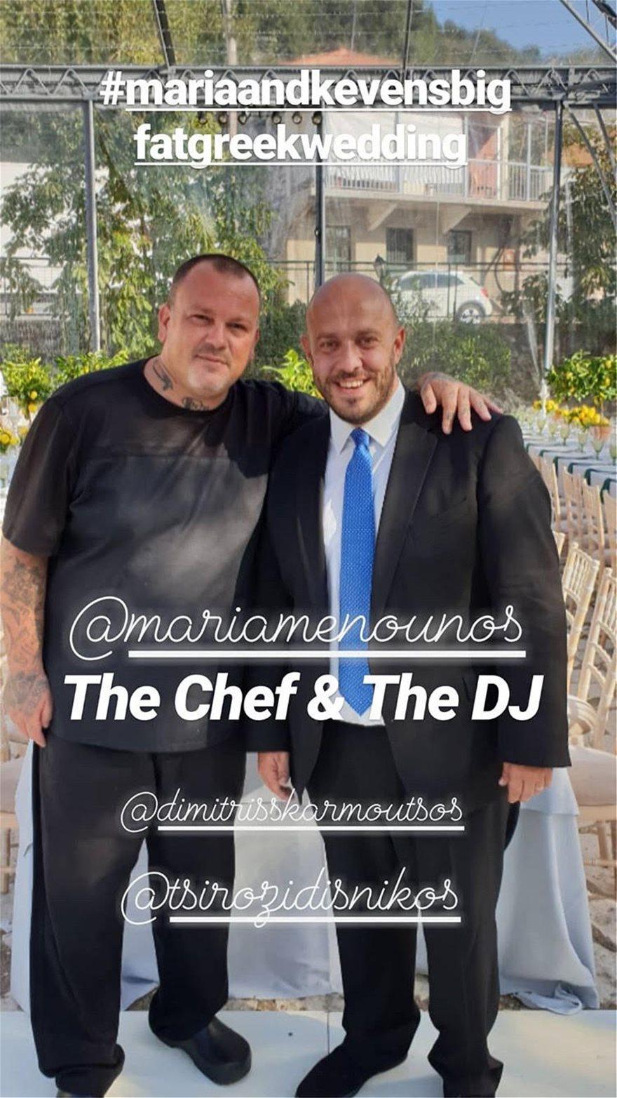 Το μενού έχει επιμεληθεί ο σεφ Δημήτρης Σκαρμούτσος και περιλαμβάνει παραδοσιακά ελληνικά πιάτα, κρύα και ζεστά εδέσματα, ενώ στο χώρο που γίνεται το γαμήλιο γλέντι έχει στηθεί και τραπέζι με προϊόντα της Αρκαδίας. Το μενού, ωστόσο, έχει έντονες πινελιές από την τοπική κουζίνα διαφόρων περιοχών και εντονότερες από την Κρήτη.