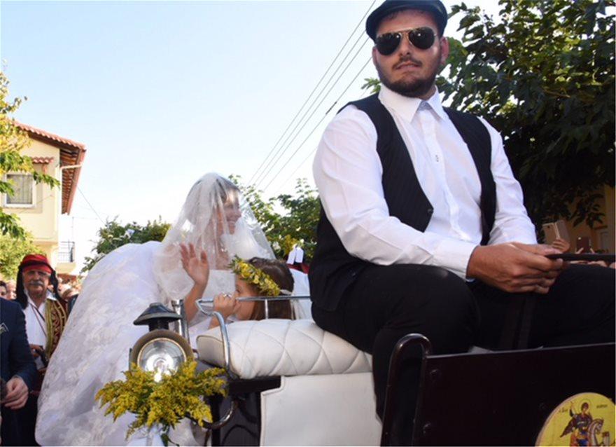 Η νύφη φορώντας το νυφικό που σχεδίασε για εκείνη η Σήλια Κριθαριώτη μπήκε σε μια άμαξα που την οδήγησε στην εκκλησία του Αγίου Νικολάου από το πατρικό της σπίτι, στήνοντας τον γαμπρό μιάμιση ώρα!