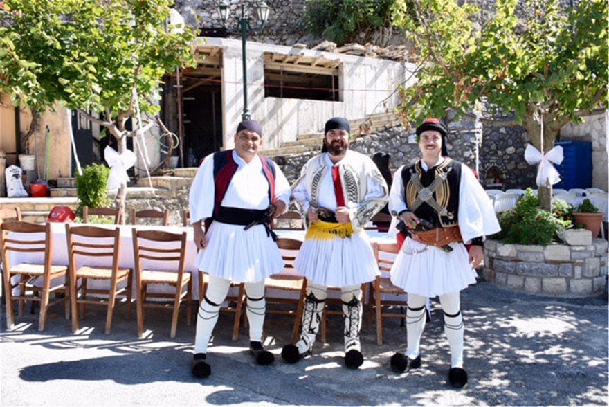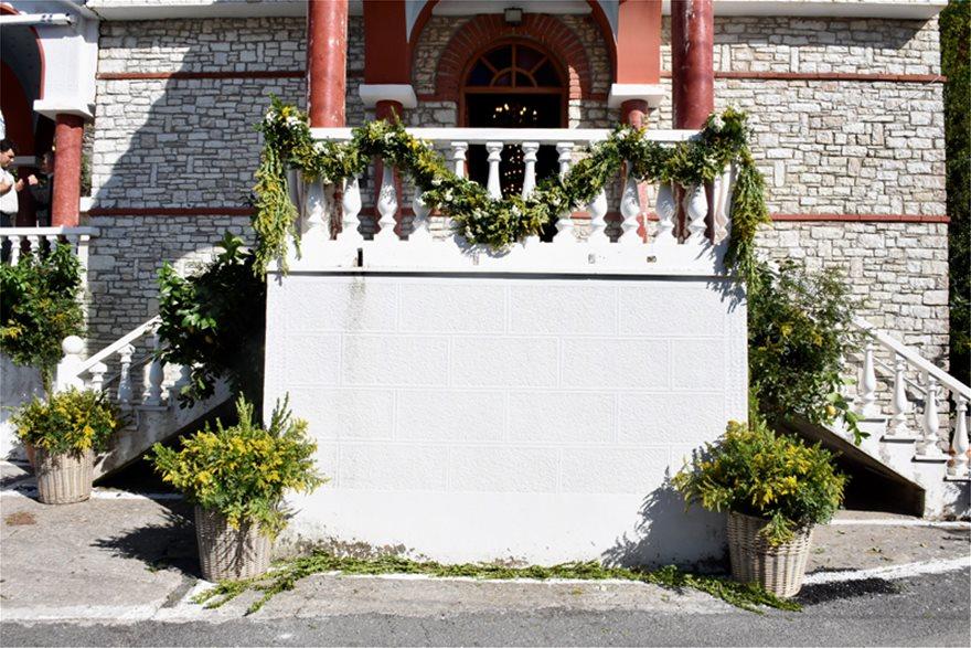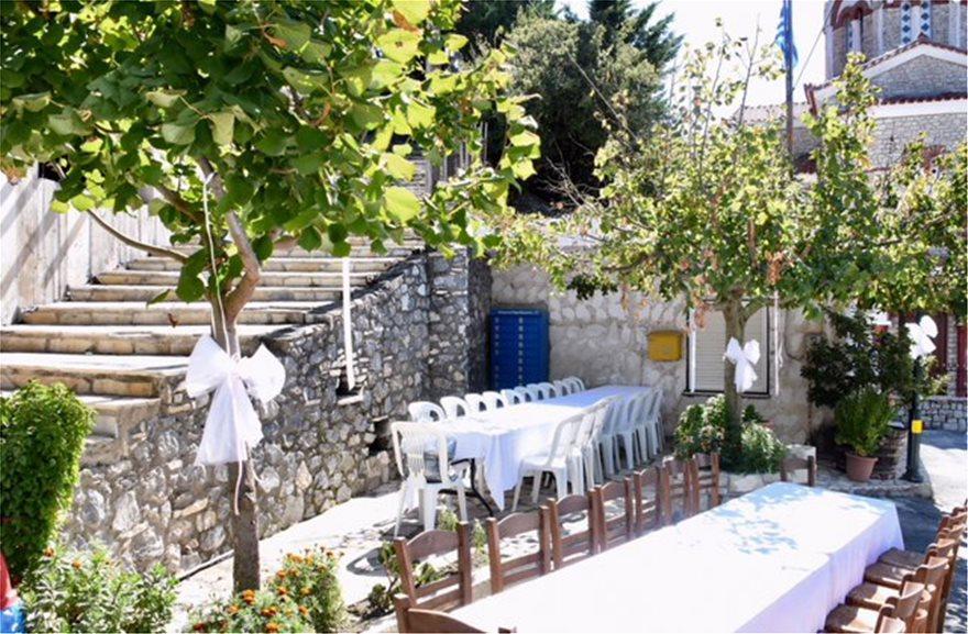Στην αυλή του σχολείου του χωριού έχει στηθεί το γαμήλιο τραπέζι με εντυπωσιακό στολισμό, όπου τα πάντα «φωνάζουν» Ελλάδα.