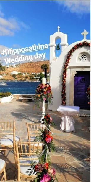 Ο Φίλιππος Μιχόπουλος επέλεξε ένα λευκό κοστούμι ενώ η νύφη έφτασε στην εκκλησία με σκάφος συνοδεία του πατέρα της και του αδερφού της που ήταν φανερά συγκινημένοι.