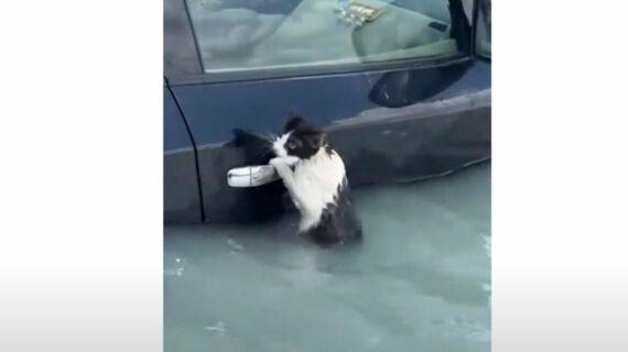 Viral έγινε ένα βίντεο που κυκλοφόρησε στα social media αφού μια άτυχη γάτα προκειμένου να σωθεί από τις σφοδρές πλημμύρες στο Ντουμπάι, γραπώθηκε από το χερούλι πόρτας αυτοκινήτου.