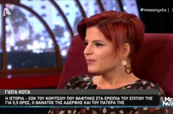 Στην εκπομπή “Μεσάνυχτα” της Ελεονώρας Μελέτη βρέθηκε η Γιώτα Κότα, η οποία καθήλωσε με τις συγκλονιστικές περιγραφές της από την 7η Σεπτεμβρίου του 1999, τότε που το σπίτι της κυριολεκτικά την καταπλάκωσε μετά τον μεγάλο σεισμό της Αθήνας.