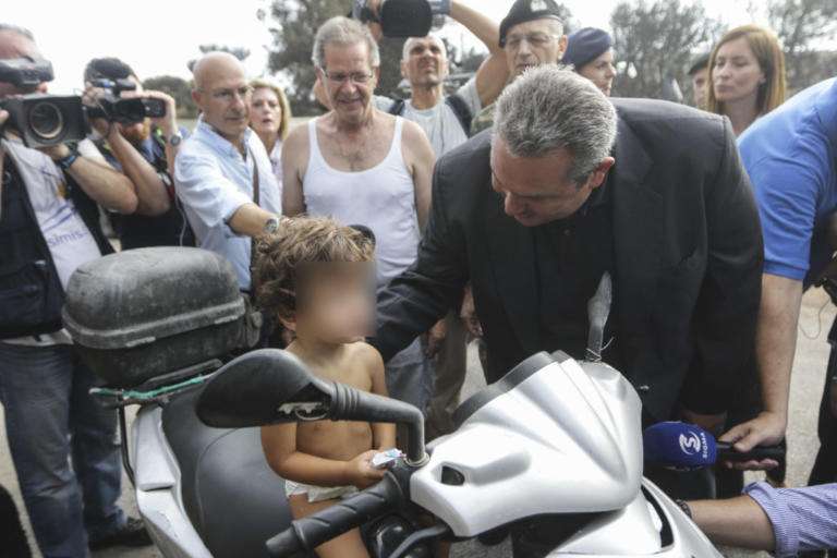 Το βλέμμα ενός μπόμπιρα λέει πολλά για όσα έζησε τις ώρες της φωτιάς. Σταμάτησε να τους χαιρετήσει ο Πάνος Καμμένος και το μικρούλι κοίταζε σαν χαμένο. Και πως να μην είναι με τόσο κόσμο γύρω του και τόση ταλαιπωρία.