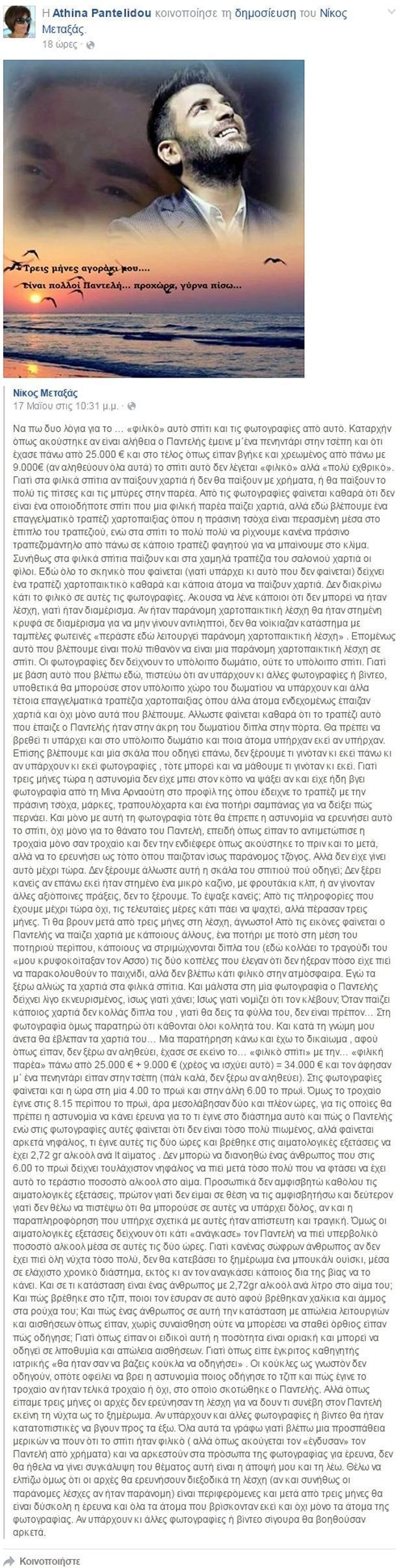Σε δεύτερη ανάρτησή του, την οποία επίσης αναδημοσιεύει στο προφίλ της η μητέρα του Παντελίδη, ο Μεταξάς αναφέρει: