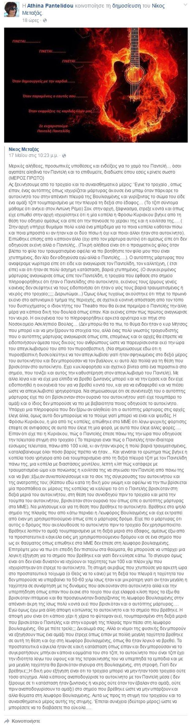 “(ΜΕΡΟΣ ΔΕΥΤΕΡΟ)Μερικές αλήθειες, προσωπικές υποθέσεις και ενδείξεις για το χαμό του Παντελή… όσοι αγαπάτε αληθινά τον Παντελή και το επιθυμείτε, διαδώστε όπου εσείς κρίνετε σωστό Συνέχεια (από το Πρώτο Μέρος): Το τροχαίο όπως είπαν έγινε στις 8.15 -8.20 π.μ. Ο Παντελής γύρω στις 9.30 π.μ. περίπου μεταφέρθηκε στο νοσοκομείο. Δηλαδή μία ώρα μετά…. Σημείωση οι δύο κοπέλες μεταφέρθηκαν στον Ευαγγελισμό που εφημέρευε και τον Παντελή τον μετέφεραν στο Ασκληπιείο Βούλας που όπως είχαν πει τότε στα ΜΜΕ δεν εφημέρευε…(δεν γνωρίζω αν αληθεύει. Αλλά αν αληθεύει, ένα νοσοκομείο που δεν εφημερεύει δεν λειτουργεί τα εξωτερικά ιατρεία του για την υποδοχή νέων ασθενών-τραυματιών, δηλαδή δεν είναι σε τέτοιου είδους ετοιμότητα). Είπαν εκεί ότι ήταν ήδη νεκρός. Και την πρώτη αναγνώριση την έκανε ο επιχειρηματίας του κέντρου στο οποίο θα έκανε πρεμιέρα την επομένη ημέρα 19/2/2016. Η οικογένεια ειδοποιήθηκε αργότερα και έφθασε στο σημείο για την επίσημη αναγνώριση… Η τροχαία που έφθασε στο σημείο, στην έκθεσή της για το ατύχημα αναφέρει: «Το όχημα που οδηγούσε ο Παντελής Παντελίδης κινούμενο με κατεύθυνση από τις εγκαταστάσεις του πρώην ανατολικού αερολιμένα Ελληνικού προς τη λεωφόρο Βουλιαγμένης έξοδος για ρεύμα προς Αθήνα εξετράπη δεξιά της πορείας του προσέκρουσε στο παρακείμενο τσιμεντένιο στηθαίο και στη συνέχεια σε μεταλλικά κάγκελα και ανετράπη εκτός δρόμου»…. Η Φρόσω Κυριάκου ήταν η μόνη που βρέθηκε σε καλή κατάσταση και σε θέση να επικοινωνεί και να μιλάει με όσους έφθασαν στο σημείο εκείνη την ώρα. Είπε όπως λέγεται ότι δεν οδηγούσε εκείνη αλλά ο Παντελής. 1. Σε ένα τροχαίο που υπάρχει ένα αυτοκίνητο που έχει ανατραπεί και που δεν βρισκόταν κανείς από τους επιβαίνοντες στη θέση του, αλλά όπως είπε ο αυτόπτης μάρτυρας στα ΜΜΕ ήσαν όλοι στον ουρανό του αυτοκινήτου, η τροχαία που φθάνει αργότερα και δεν έχει δει το συμβάν εκείνη τη στιγμή, δεν είναι δυνατόν να ξέρει ποιος οδηγούσε ή όχι το αυτοκίνητο. 2. Αν αρκέστηκαν στην δήλωση της Φρόσως Κυριάκου εκείνη τη στιγμή ότι οδηγός ήταν ο Παντελίδης, αυτό κατά τη γνώμη μου θα έπρεπε να γραφτεί ως πιθανός οδηγός ή ότι δεν προκύπτει ποιος είναι ο οδηγός. 3. Επειδή δυνητικά θα μπορούσαν να είναι και οι τρεις οδηγοί του αυτοκινήτου εφόσον δεν βρίσκονταν στη θέση τους λόγω της ανατροπής, θα έπρεπε να γίνει αλκοτέστ τουλάχιστον σε αυτόν που ήταν σε καλή κατάσταση, δηλαδή στην Φρόσω Κυριάκου, αφού στους άλλους δεν ήταν δυνατόν να κάνουν ( ο Παντελής ίσως νεκρός και η Μίνα Αρναούτη βαριά τραυματίας) ανεξάρτητα των δηλώσεων της Κυριάκου ότι οδηγούσε ο Παντελής. Η να γίνει εξέταση αίματος για αλκοόλ στο νοσοκομείο, δεν ξέρω αν έγινε. Ειπώθηκε όμως τότε στα ΜΜΕ ότι οι κοπέλες είχαν καταναλώσει αλκοόλ”.