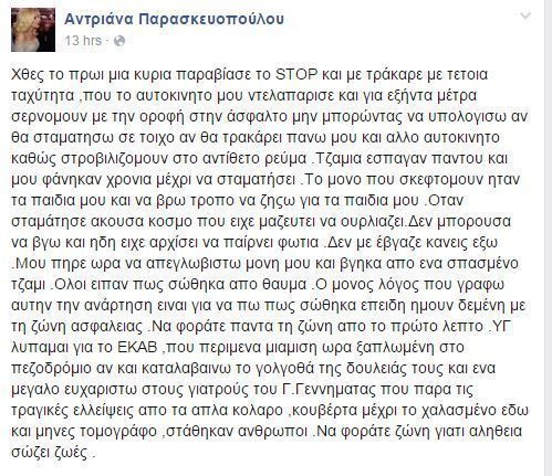 Το απόγευμα της επόμενης ημέρας, έχοντας συνέλθει από το σοκ, αποφάσισε να μοιραστεί με τους χιλιάδες φίλους της στο facebook το περιστατικό, για να περάσει ένα μήνυμα προς όλους: Η ζώνη σώζει ζωές. Όπως η ίδια λέει, μια γυναίκα οδηγός παραβιάζοντας το STOP χτύπησε το δικό της αυτοκίνητο, με μεγάλη ταχύτητα και αποτέλεσμα το όχημα να ντελαπάρει και να σέρνεται στην άσφαλτο επί 60 μέτρα.