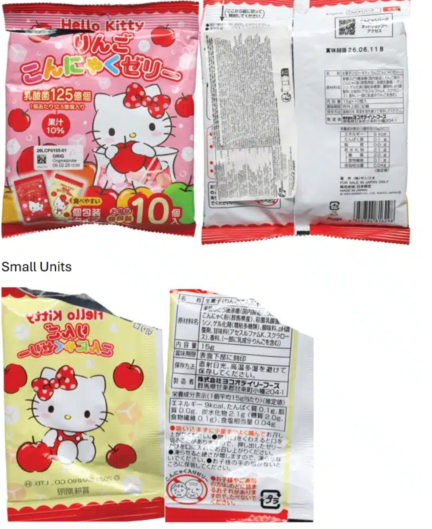Το προϊόν ταυτοποιήθηκε στο Λουξεμβούργο ως Hello Kitty confiserie en gelée goût pomme Koniac της εταιρείας Sanrio Co., LTD. με έδρα το Τόκιο. Πρόκειται για συσκευασία 125 γραμμαρίων με γραμμωτό κώδικα 4952794816298, ημερομηνία λήξης 11 Ιουνίου 2026 και αριθμό παρτίδας 26.06.11B. Η διανομή στο Λουξεμβούργο έγινε μέσω σημείων λιανικής πώλησης.