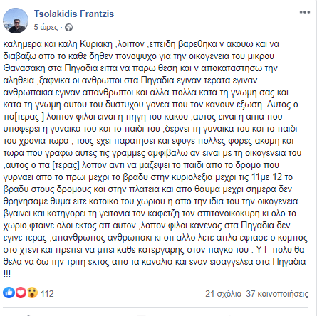Αυτος ο πα [τερας] λοπον αντι να μαζεψει το παιδι απο το δρομο που γυρναει απο το πρωι μεχρι το βραδυ στην κυριολεξια μεχρι τις 11με 12 το βραδυ στους δρομους και στην πλατεια και απο θαυμα μεχρι σημερα δεν θρηνήσαμε θυμα ειτε κατοικο του χωριου η απο την ιδια του την οικογενεια βγαινει και κατηγορει τη γειτονια τον καφετζη τον σπιτονοικοκυρη κι ολο το χωριο,φταινε ολοι εκτος απ αυτον