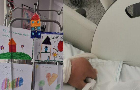 Ζωγραφιές γέμισε από χθες η ΜΕΘ Παίδων του νοσοκομείου του Ρίου, όπου νοσηλεύεται ο 6χρονος Φώτης.