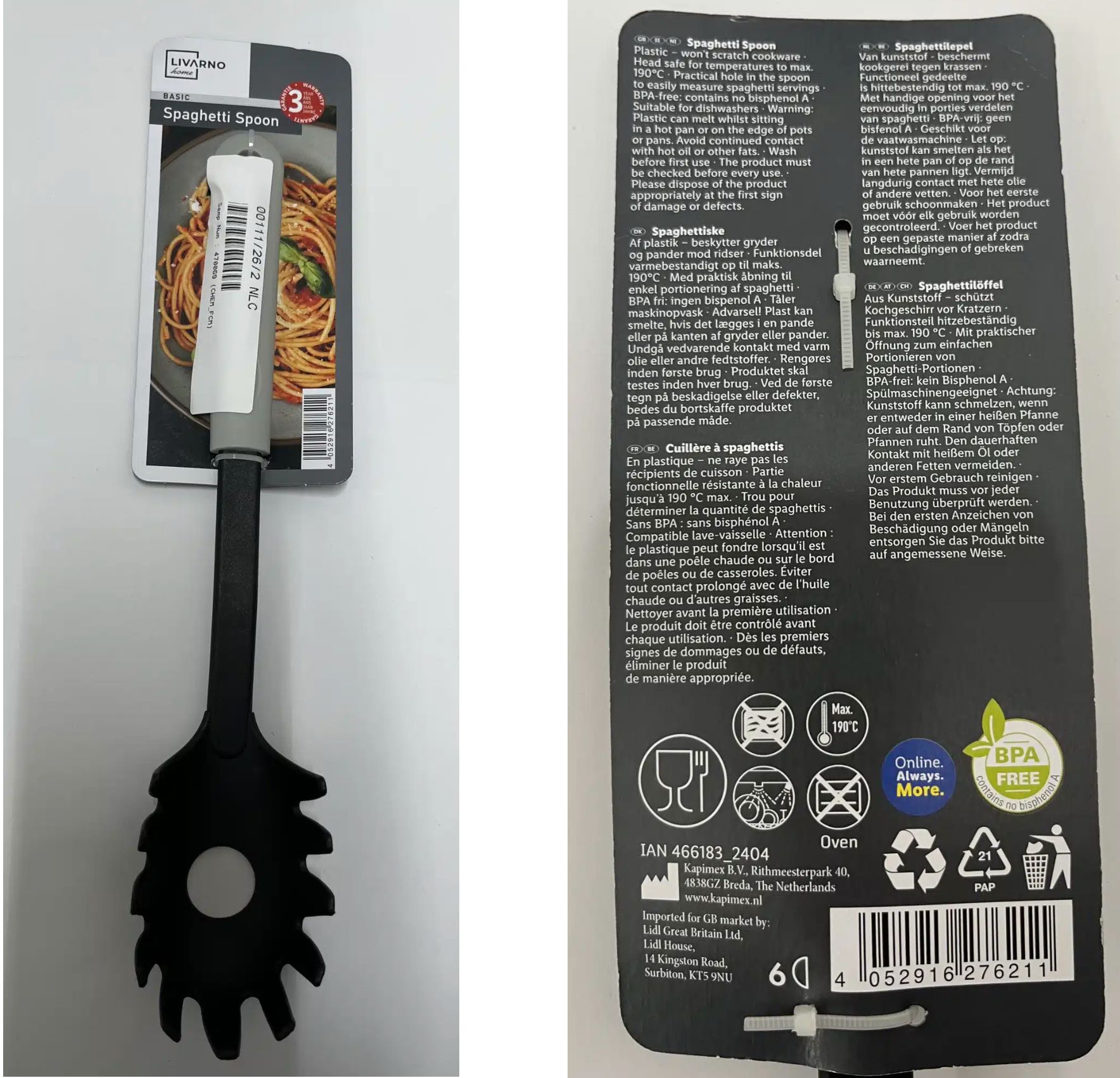 Σύμφωνα με τα στοιχεία της ανακοίνωσης, πρόκειται για μαύρη πλαστική κουτάλα για σπαγγέτι με αριθμό IAN 466183 και κωδικό EAN 4052916276211. Προμηθευτής του προϊόντος είναι η εταιρεία OWIM GmbH & Co. KG με έδρα τη Γερμανία, ενώ η χώρα παραγωγής αναφέρεται ως η Ολλανδία. Η διάθεση στη σλοβενική αγορά έγινε από τη Lidl Slovenija.
