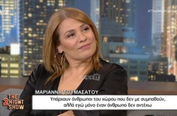 Τη Μαριάννα Τουμασάτου φιλοξένησε στο “The 2night Show” ο Γρηγόρης Αρναούτογλου. Η γνωστή ηθοποιός, μάλιστα, τόνισε πως υπάρχουν άτομα που δεν τη συμπαθούν καθόλου, ενώ πρόσθεσε πως η ίδια δεν αντέχει έναν συγκεκριμένο άνθρωπο. Δείτε περισσότερα με ένα ΚΛΙΚ ΕΔΏ