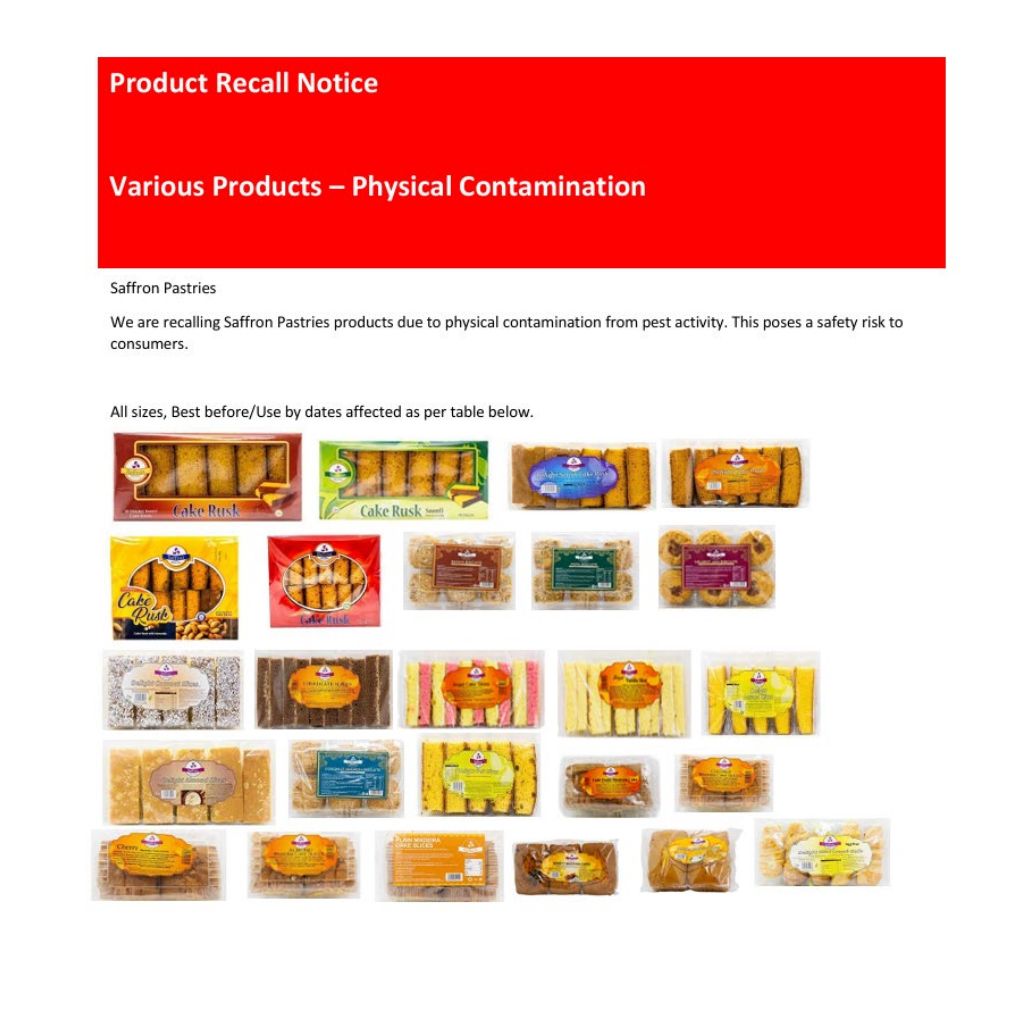 Ανάκληση μεγάλης κλίμακας σε μπισκότα και κέικ της Saffron Pastries, ανακοίνωσε η αρμόδια αρχή ασφάλειας τροφίμων του Ηνωμένου Βασιλείου (FSA), αλλά και οι αρχές του Βελγίου μετά από ειδοποίηση του ευρωπαϊκού RASFF, λόγω κινδύνου επιμόλυνσης από τρωκτικά.