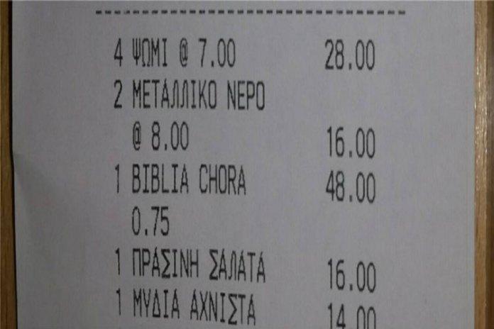 Μπορεί να χρειάστηκε να πληρώσει 48 ευρώ για ένα μπουκάλι λευκό κρασί γνωστής μάρκας, το οποίο στα περισσότερα σημεία στην υπόλοιπη χώρα στοιχίζει περίπου τα μισά, να έδωσε 16 ευρώ για μια πράσινη σαλάτα και 14 ευρώ για μια μερίδα μύδια αχνιστά, όμως πραγματικά δυσανασχέτησε πραγματικά όταν είδε την τιμή για το ψωμί: 28 ευρώ για τέσσερις φέτες, δηλαδή 7 ευρώ η κάθε φέτα ψωμί!