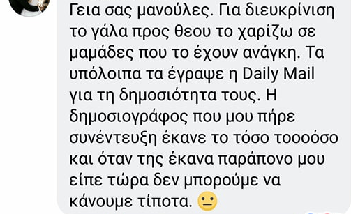 Ωστόσο, σύμφωνα με άλλες πληροφορίες αλλά και από την ίδια την μητέρα, η δράση της είναι εντελώς διαφορετική. Η ίδια δωρίζει το γάλα της σε μωρακια που το εχουν αναγκη. Ποτε δεν πουλησε η δεν το κανει για κερδοσκοπια. Δείτε και το σχόλιο της ίδιας σε διάφορες ομάδες, η οποία αναφέρει οτι τα λεγόμενα της διαστρεβλώθηκαν και οτι θα κινηθεί νομικά για να βρει το δίκιο της.