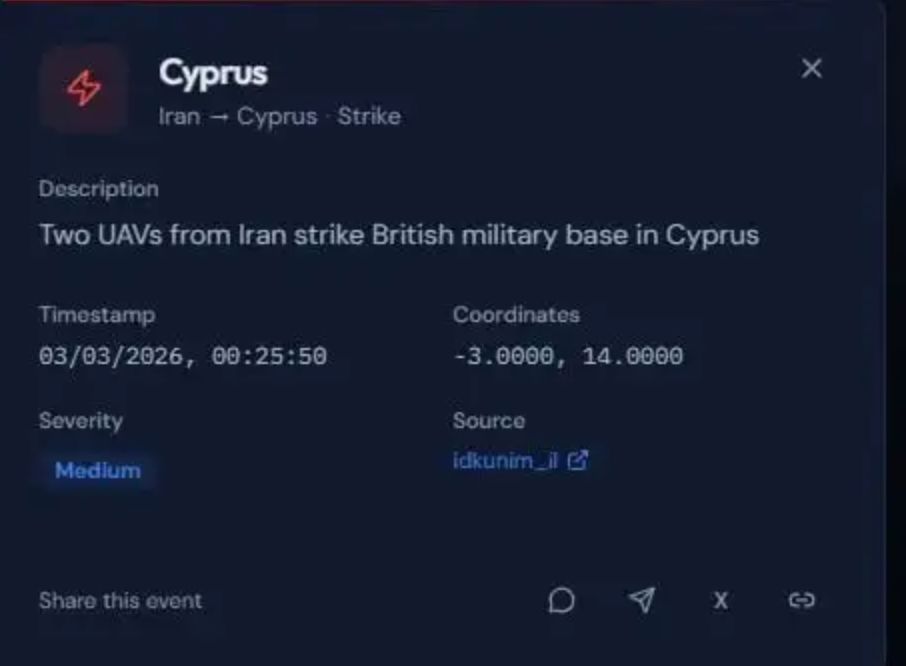 Σε κανάλια στο Telegram γίνεται λόγος για 2 ιρανικά Drones από Ιράν που επιχείρησαν να πλήξουν βρετανικές βάσεις.