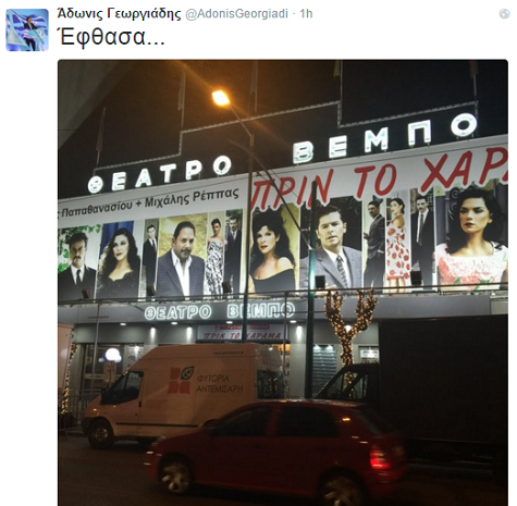 Έτσι, λίγο μετά τις 10 το βράδυ ο Άδωνις Γεωργιάδης, διαμαρτυρόμενος για κάποια σχόλια του Λάκη Λαζόπουλου, έφτασε έξω από το θέατρο «Βέμπο» και μάλιστα, «ανέβασε» Twitter και μια φωτογραφία, προκειμένου να ενημερώσει τους διαδικτυακούς του φίλους για τις κινήσεις του.