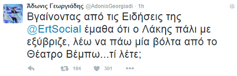 «Ο κ. Λαζόπουλος αρνείται να μου δώσει τον λόγο στην εκπομπή του. Εγώ δεν φοβάμαι τον Λάκη και θέλω μία ΝΔ που δεν θα τον φοβάται επίσης…», «τιτίβισε» ο κ. Γεωργιάδης.