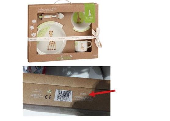 Πρόκειται για παιδικό σετ φαγητού 4 τεμαχίων που περιλαμβάνει πιάτο, μπολ, κούπα και κουτάλι, προέλευσης Κίνας, με εμπορική ονομασία «Sophie la giraffe», με αριθμό παρτίδας 897275 και κωδικό προϊόντος Ref: 2201124.