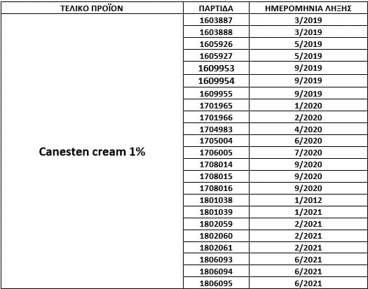 Την ανάκληση συγκεκριμένων παρτίδων της γνωστής κρέμας για δερματολογικά προβλήματα, Canesten cream 1%, κατόπιν εκτός προδιαγραφών αποτελεσμάτων όσον αφορά το προϊόν αποδόμησης καρβινόλη, ανακοίνωσε ο Εθνικός Οργανισμός Φαρμάκων (ΕΟΦ).