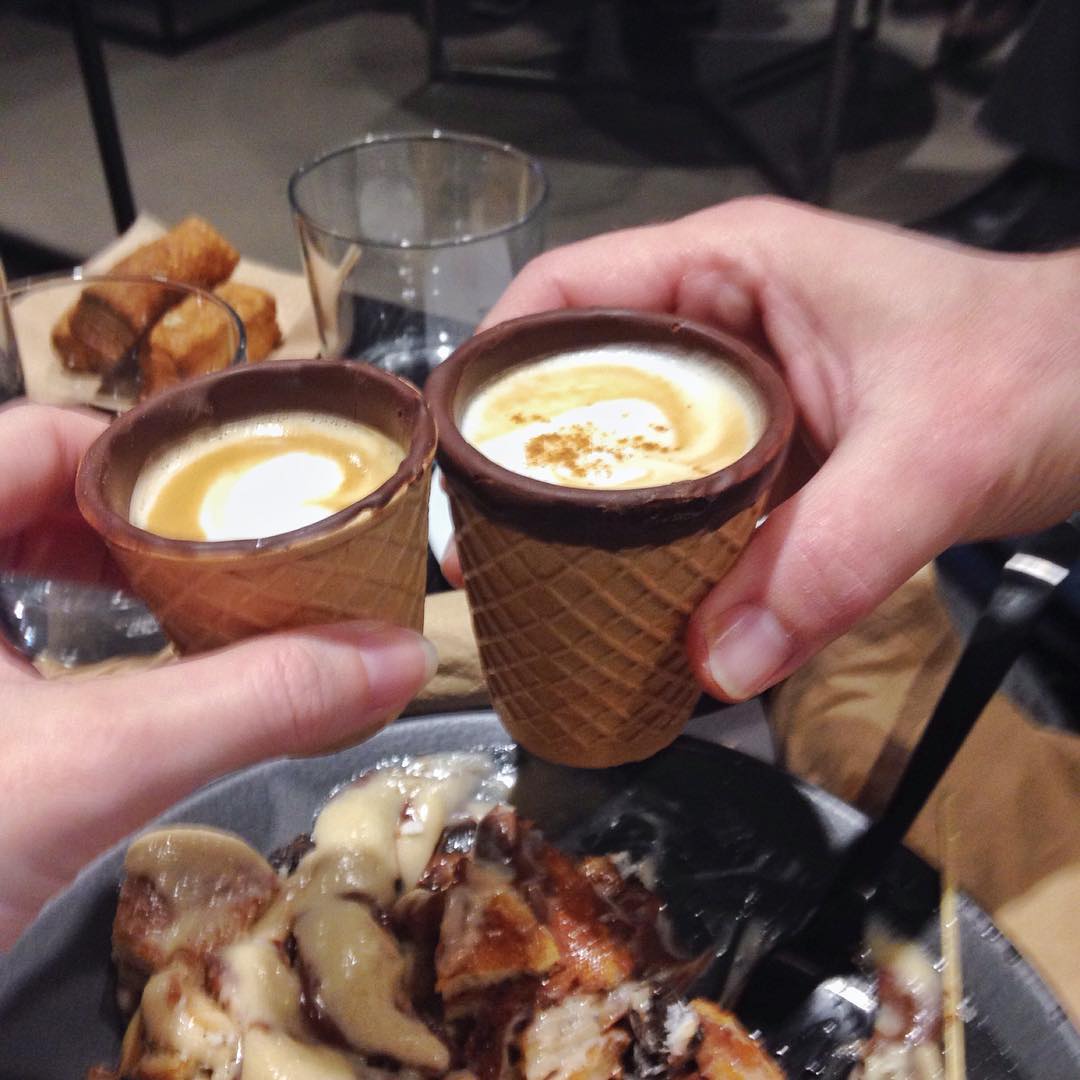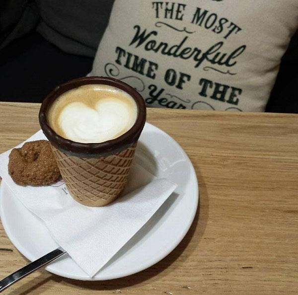 Χωνάκι παγωτού, επικάλυψη σοκολάτας και μέσα το απολαυστικό καφέδάκι σου, εσπρέσο, καπουτσίνο ή λάτε. Ναι, δεν σπάει, δεν «διαρρέει» και στο τέλος υπηρετεί τον υπέρτατο σκοπό του. Διαλύεται απολαυστικά στο στόμα. Μια βόλτα από το καφέ, με το κατά πως λέγεται απολαυστικό burnch, θα σας πείσει.