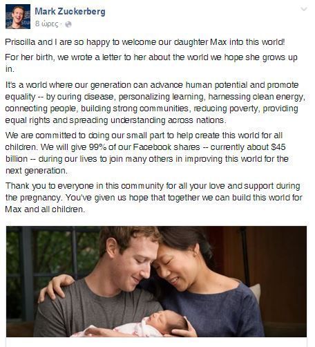 Η γέννηση της μικρής Max, της κόρης του ιδρυτή του Facebook είναι όπως όλοι αντιλαμβανόμαστε ένα γεγονός παγκόσμιας εμβέλειας. Το ζευγάρι περίμενε με αγωνία την γέννηση του παιδιού τους, κάτι που το γιόρτασαν με έναν μοναδικό τρόπο: την απόφαση να δώσουν το 99% των μετοχών του Facebook αξίας πάνω από 45 δισεκατομμύρια δολάρια σε ένα ίδρυμα που έχουν ιδρύσει για την ενίσχυση ανθρωπιστικών οργανώσεων. Η δωρεά αυτή δεν θα γίνει άμεσα, αλλά μέσα στην πορεία του χρόνου, καθ” όλη την διάρκεια της ζωής του Zuckerberg και της γυναίκας του.