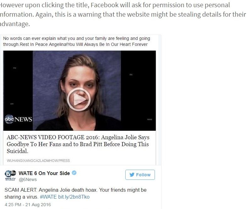 Η Angelina Jolie «έβαλε» τέλος στη ζωή της. Μία είδηση που ακούγεται τουλάχιστον λυπηρή και τραγική. Μία γυναίκα που αγωνίζεται όσο περισσότερο μπορεί για να προστατέψει κυρίως παιδιά και φτωχά έθνη. Τι συνέβη όμως; Για να σε προλάβουμε πριν πάθεις απανωτά mini εγκεφαλικά, η Angelina Jolie ζει και βασιλεύει. Ο θάνατος της είναι ένας ιός που κυκλοφορεί αυτές τις ώρες το διαδίκτυο. Προσοχή δηλαδή.