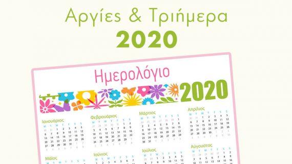 Πρωτοχρονιά: 1 Ιανουαρίου 2020, ημέρα Τετάρτη. Θεοφάνεια: 6 Ιανουαρίου 2020, ημέρα Δευτέρα Καθαρά Δευτέρα: 2 Μαρτίου του 2020 Ευαγγελισμός Θεοτόκου: 25 Μαρτίου του 2020, ημέρα Τετάρτη. Μεγάλη Παρασκευή: 17 Απριλίου του 2020. Μεγάλο Σάββατο: 18 Απριλίου του 2020. Κυριακή του Πάσχα: 19 Απριλίου του 2020 Δευτέρα του Πάσχα: 20 Απριλίου του 2020
