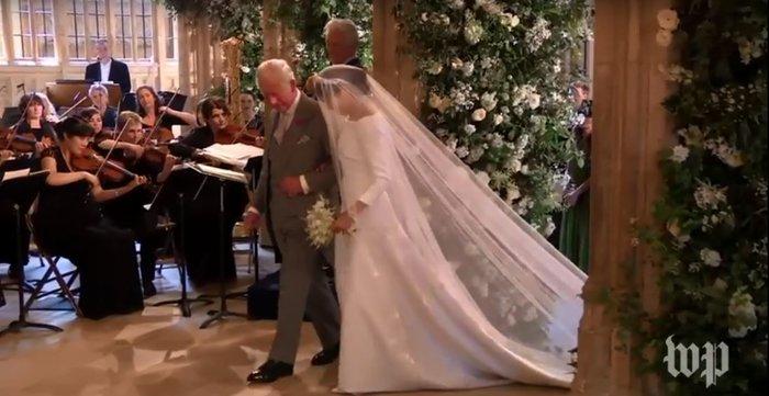 Το νυφικό της Μαρκλ ήταν η μεγάλη έκπληξη της ημέρας, αφού το όνομα του σχεδιαστή και φυσικά το σχέδιο κρατούνταν ως επτασφράγιστο μυστικό. Το νυφικό ήταν έτοιμο 10 ημέρες πριν τον γάμο και φυλάσσονταν καλά σε κάποια άδεια αίθουσα του κάστρου τρων Ουίνδσορ. Η μόνη που το είχε δει, προκειμένου να δώσει την έγκρισή της, ήταν η βασίλισσα Ελισάβετ.