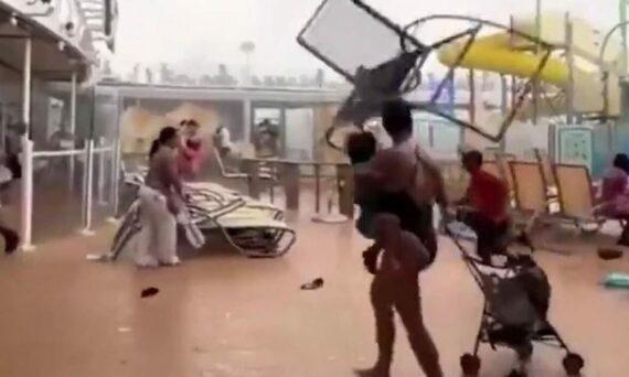 Όπως μπορείτε να δείτε στα βίντεο ομπρέλες, ξαπλώστρες και καρέκλες άρχισαν να «πετούν» με τους επιβάτες του κρουαζιερόπλοιου να προσπαθούν να κρυφτούν όπου μπορούν.
