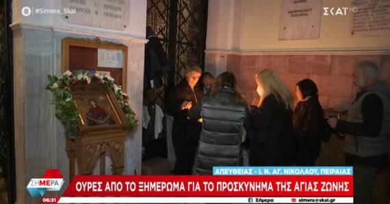 Ουρές υπάρχουν από τα ξημερώματα στον Ιερό Ναό του Αγίου Νικολάου στον Πειραιά, όπου συρρέουν οι πιστοί για να προσκυνήσουν την Αγία Ζώνη της Παναγίας.