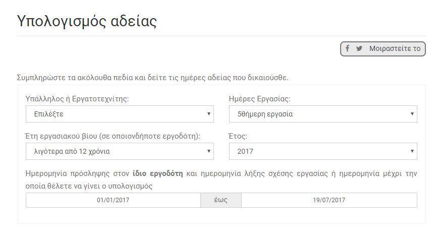 Μια γρήγορη λοιπόν και υπεύθυνη απάντηση στο ερώτημα «πόστες ημέρες άδεια δικαιούμαι» μπορούν να λάβουν οι απασχολούμενοι στον ιδιωτικό τομέα πηγαίνοντας στην ιστοσελίδα του Κέντρου Πληροφόρησης Εργαζομένων και Ανέργων της ΓΣΕΕ όπου το μόνο που χρειάζεται είναι η συμπλήρωση έξι πεδίων και ο υπολογισμός των ημερών αδειας γίνεται οn line μέσα σε δευτερόλεπτα.