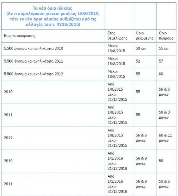 – Στην ηλικία των 50 ετών µε µειωµένη σύνταξη και των 55 µε πλήρη, εφόσον η συµπλήρωση των 5.500 ενσήµων έγινε µέχρι τις 31/12/2010 (και εφόσον τότε είχαν ανήλικο παιδί) και το όριο ηλικίας έχει συµπληρωθεί µέχρι τις 18/8/2015. – Στην ηλικία των 52 ετών µε µειωµένη σύνταξη και των 57 µε πλήρη, εφόσον η συµπλήρωση των 5.500 ενσήµων έγινε µέχρι τις 31/12/2011 (και εφόσον τότε είχαν ανήλικο παιδί) και το όριο ηλικίας έχει συµπληρωθεί µέχρι τις 18/8/2015. – Στην ηλικία των 55 ετών µε µειωµένη σύνταξη και των 60 µε πλήρη, εφόσον η συµπλήρωση των 5.500 ενσήµων έγινε µέχρι τις 31/12/2012 (και εφόσον τότε είχαν ανήλικο παιδί) και το όριο ηλικίας έχει συµπληρωθεί µέχρι τις 18/8/2015.