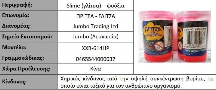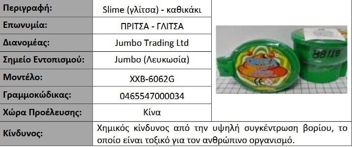 Σύμφωνα με πρόσφατη ανακοίνωση της Υπηρεσίας Προστασίας Καταναλωτή της Κύπρου (η αντίστοιχη ελληνική Γενική Γραμματεία Βιομηχανίας) που είναι η αρμόδια αρχή για την εφαρμογή της Ασφάλειας των Προϊόντων, αποσύρονται ορισμένα επικίνδυνα παιχνίδια (τύπου slime) από την κυπριακή και την ελληνική αγορά, τα οποία πωλούνταν στα καταστήματα της πασίγνωστης αλυσίδας παιχνιδιών JUMBO.