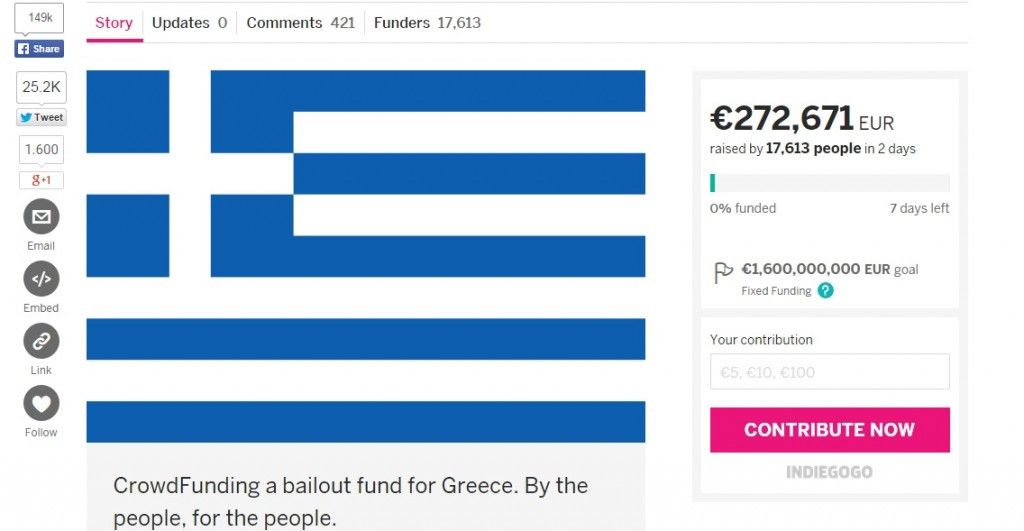 H ιδέα του Thom Feeney για να μαζευτούν τα χρήματα της επόμενης δόσης για την Ελλάδα, 1,6 δις ευρώ, έχει θεαματική ανταπόκριση και γίνεται κεντρικό θέμα στα μεγαλύτερα websites του πλανήτη. Λίγο πριν τις 20.00 σήμερα 30/6 από την μεγάλη επισκεψιμότητα “έπεσε το site! Διαβάστε όλες τις λεπτομέρειες για την πρωτοβουλία που έχει βρει διεθνώς τεράστια ανταπόκριση. Οι Ευρωπαίοι θέλουν να σώσουν την Ελλάδα…