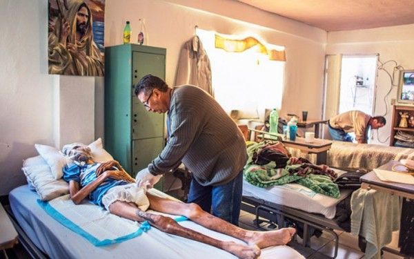 Ο Sergio Borrego, που βοηθά στην διοίκηση του ασύλου Albergue Las Memorias HIV/AIDS, τοποθετεί ένα ύφασμα στο πρόσωπο του 51χρονου Pedro Robles, ώστε να μην τον ενοχλούν οι μύγες καθώς διανύει τις τελευταίες του ώρες ως ασθενής. Ο Pedro, ζήτησε τη βοήθεια του ιδρύματος, όντας σε θλιβερή κατάσταση από τον ιό, ενώ εξαιτίας της γραφειοκρατίας δεν έλαβε έγκαίρως φαρμακευτική αγωγή, με αποτέλεσμα να πεθάνει χωρίς να μπορέσει να εξεταστεί από γιατρό.